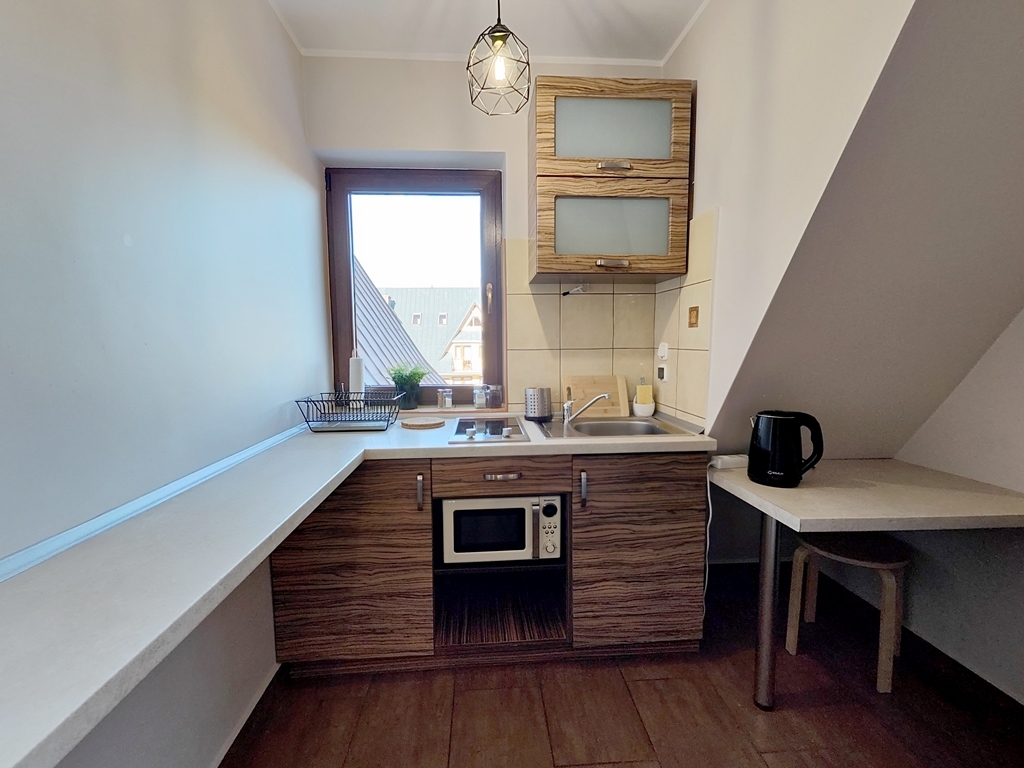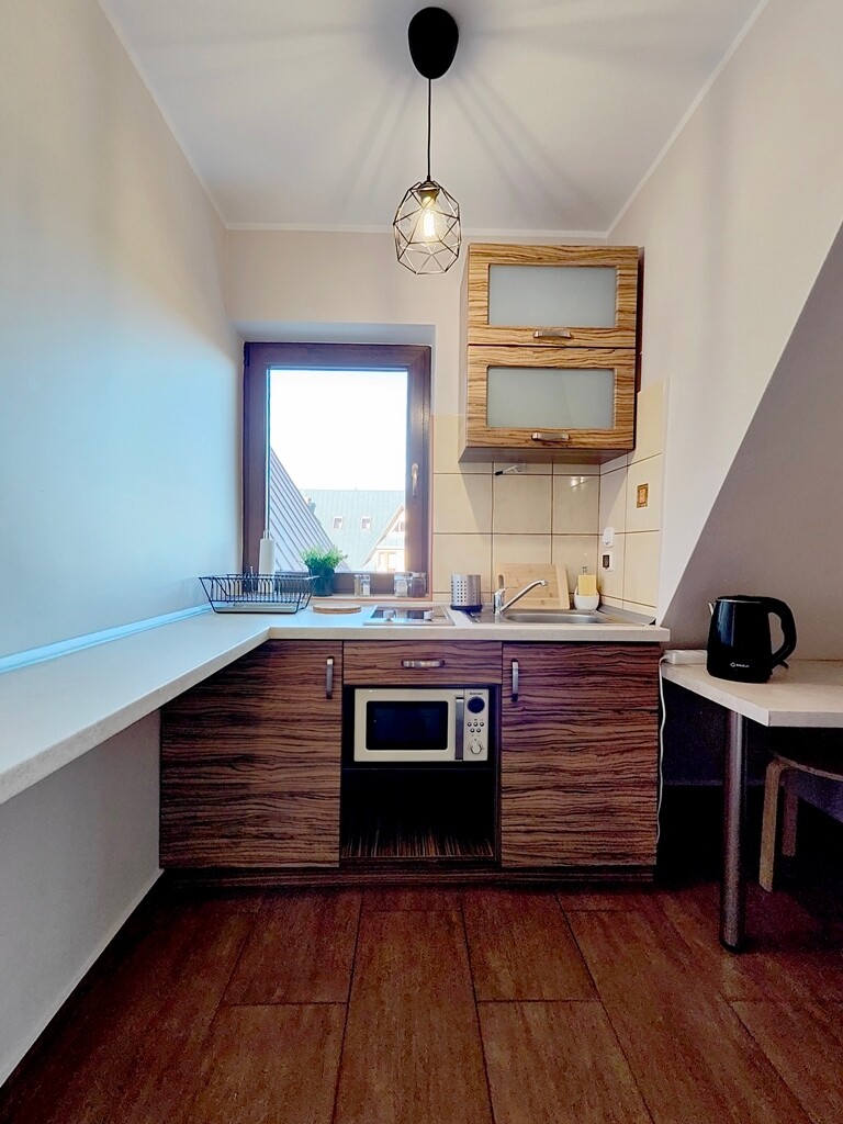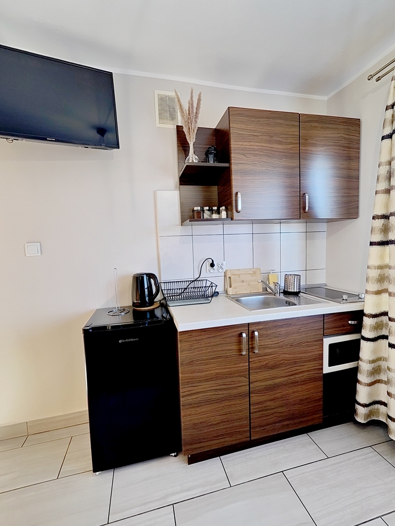kuchenka elektryczna, czajnik , mikrofala, naczynia, garnki, lodówka, dostęp do żelazka
